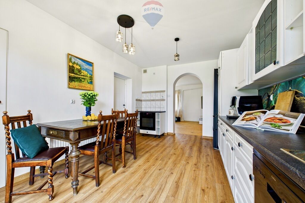 Kuchnia pozostaje w pełni umeblowana i wyposażona w sprzęty AGD. Na